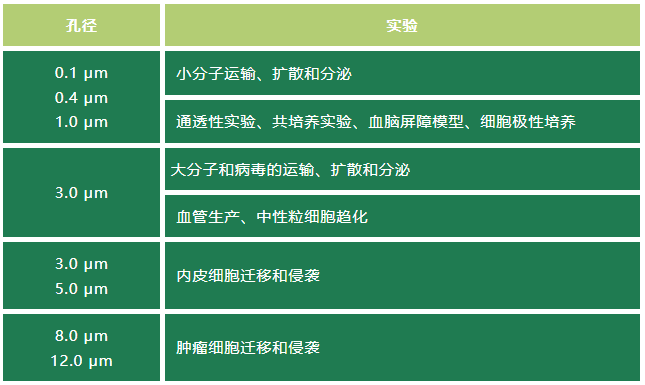 潔特生物細胞嵌入皿提供0.1μm、0.4μm、1.0μm、3.0μm、5.0μm、8.0μm、12.0 μm等孔徑選擇,可參考下表選擇合適的孔徑。