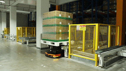 在立庫(kù)巨大的鋼貨架之間,有8條達(dá)60米的狹長(zhǎng)巷道,每條巷道上,都有一位“擎天柱”——堆垛機(jī),它們代替了傳統(tǒng)的人工和高位叉車,在貨架間快速升降穿梭,精準(zhǔn)地從不同儲(chǔ)位取出或放入貨物。地面上,穿梭車(RGV)和自動(dòng)導(dǎo)引車(AGV)來回穿梭,承擔(dān)著物料與成品的運(yùn)輸任務(wù),保障貨物的高效流轉(zhuǎn)。而貨物分揀環(huán)節(jié),則由專業(yè)的機(jī)械手精準(zhǔn)完成。