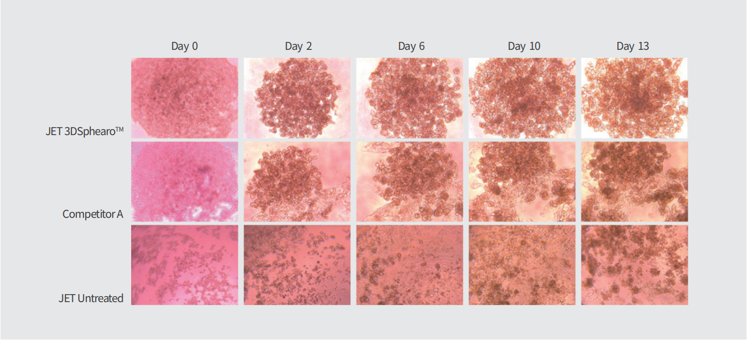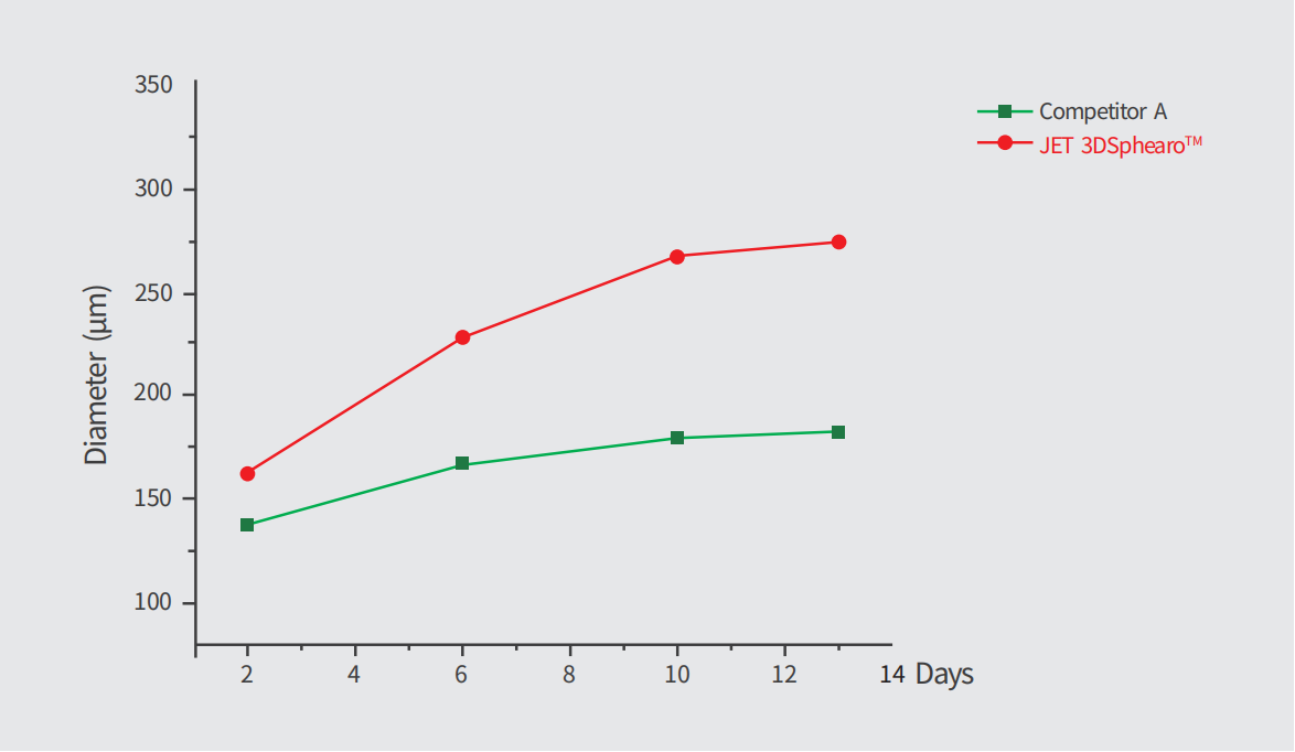 結(jié)果表明,相對同類進(jìn)口產(chǎn)品,在細(xì)胞培養(yǎng)時(shí)間不超過13天時(shí),可明顯觀察到培養(yǎng)在3DSphearo™表面的細(xì)胞的生長狀態(tài)更佳,成球粒徑也更大。