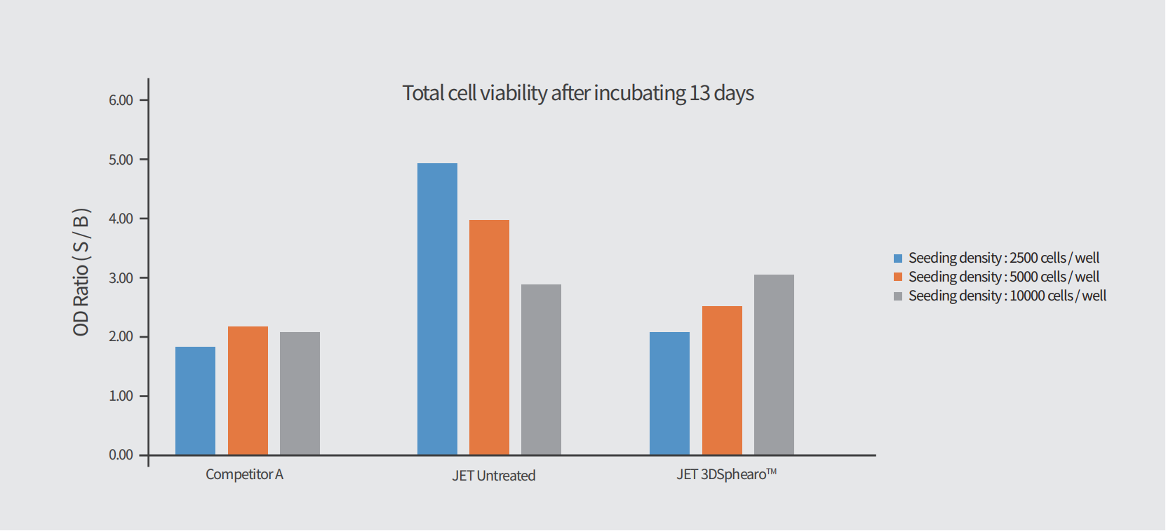 圖3:細(xì)胞培養(yǎng)至第13 天后,往不同接種密度的各樣品孔中加入 20μL /孔的 CCK-8 溶液,室溫避光靜置顯色 2h,然后將顯色后的樣品按 120μ L/孔的體積轉(zhuǎn)移到平底的 96 孔板中,并立馬置于酶標(biāo)儀中進(jìn)行吸光值的讀取,計(jì)算細(xì)胞總活力。