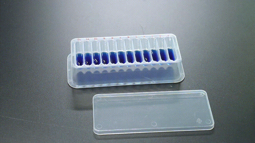 ● 潔特生物12道加樣槽,采用符合USP CLASS VI標準的優(yōu)質(zhì)聚丙烯制成,透明可視、液體殘留少